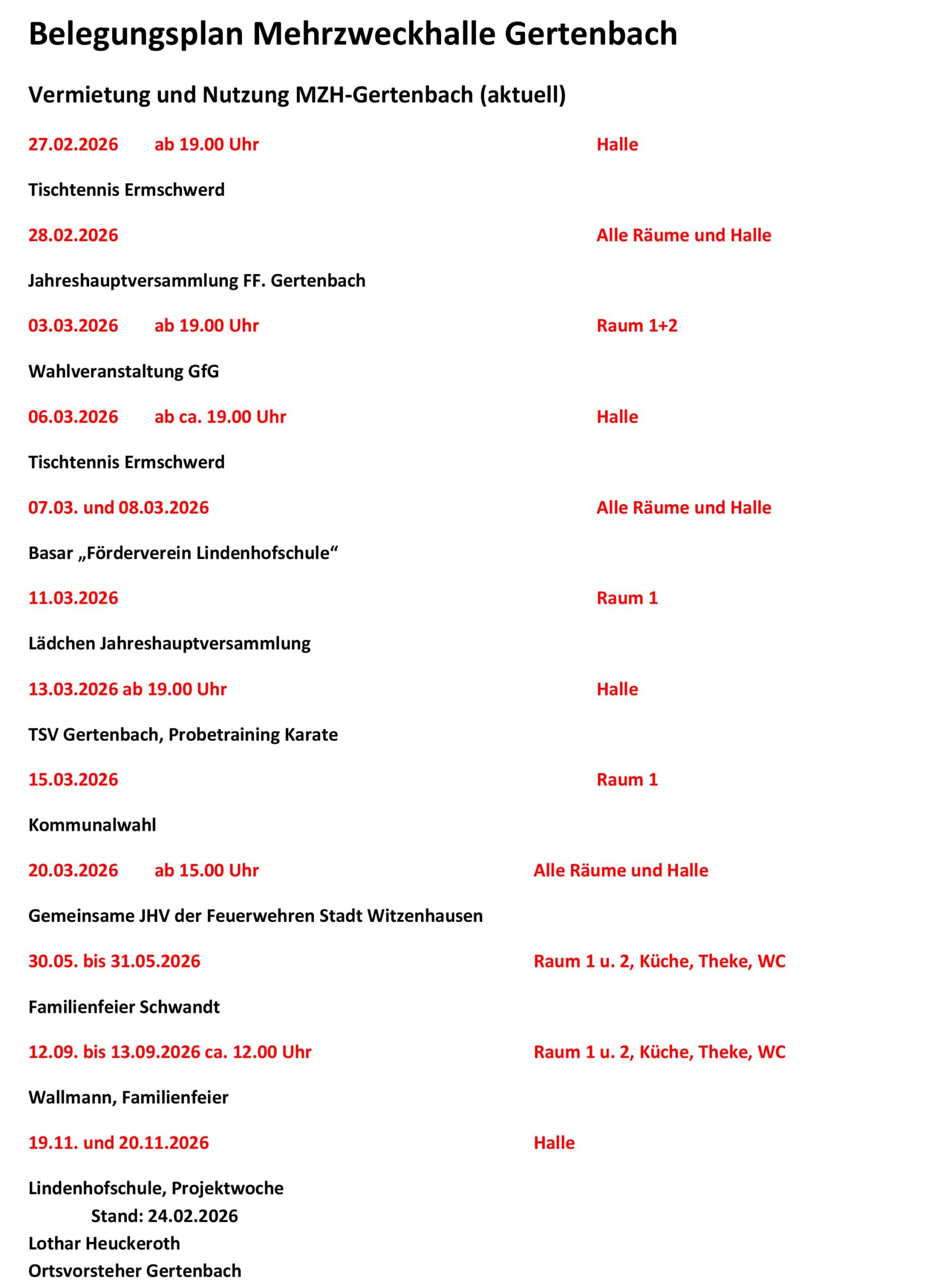 Aktueller Belegungsplan Mehrzweckhalle Gertenbach